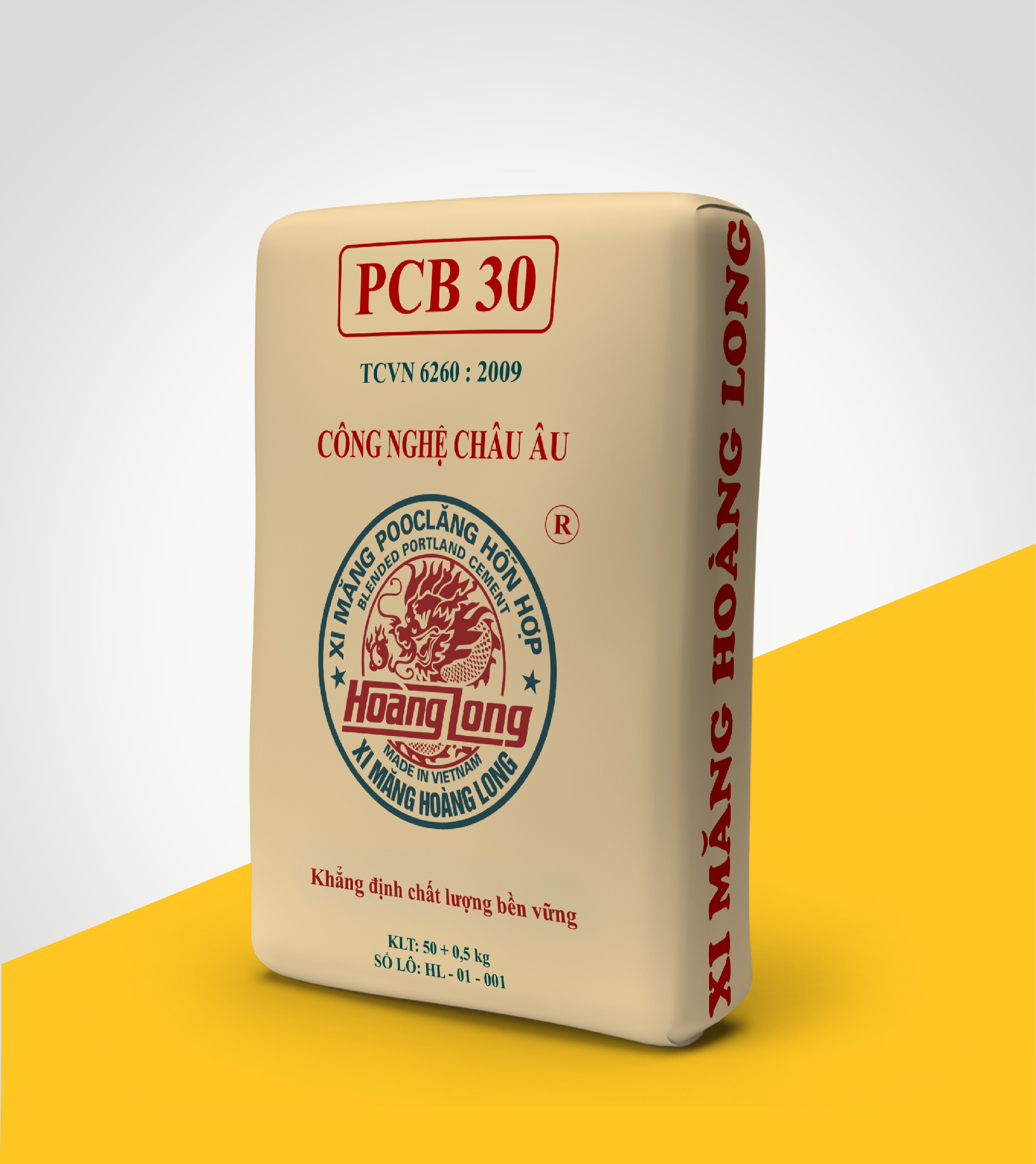 Sản phẩm xi măng được đựng trong các vỏ bao KPK nhãn hiệu con rồng bay lên được in màu đỏ, xem giữa là dòng chữ HOÀNG LONG màu đỏ